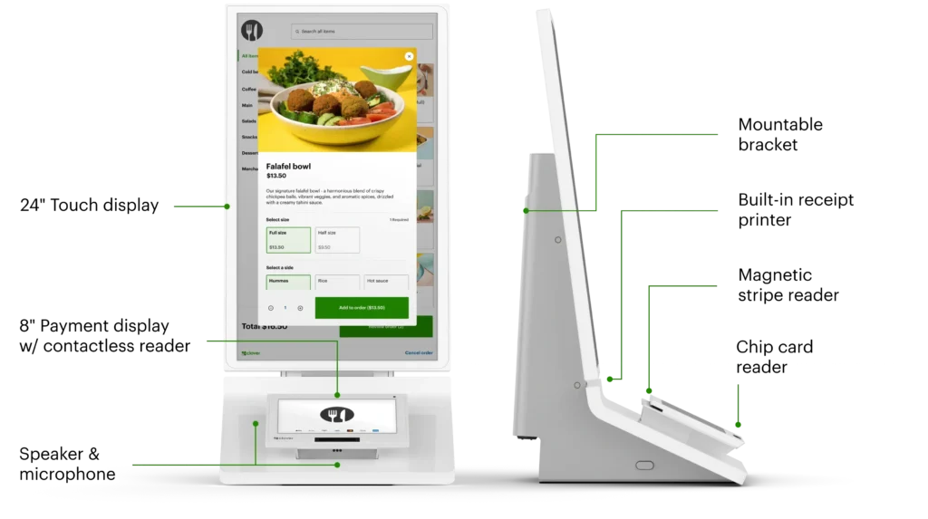 Our all-in-one device features an enterprise grade 24″ display, versatile payment terminal, and a built-in printer, all with low-touch set up.